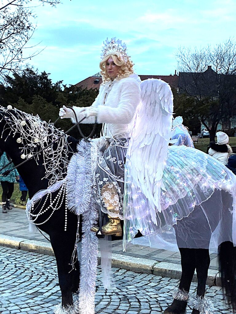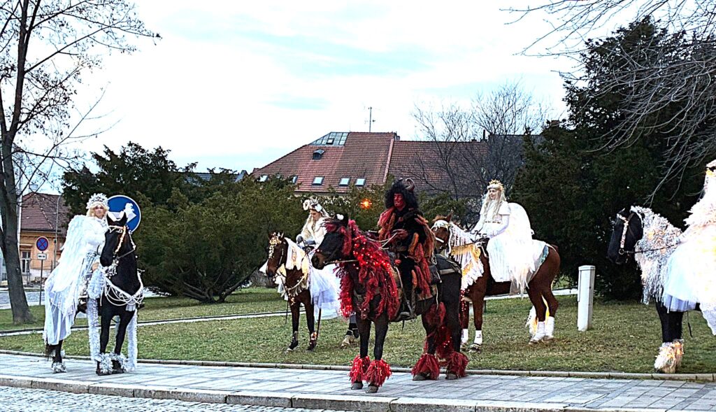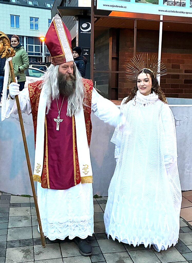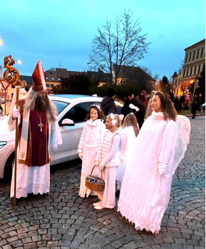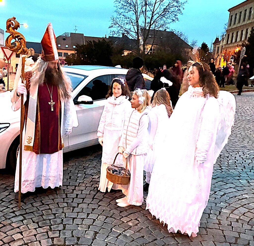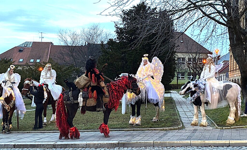 Obvykle přichází Mikuláš se svou družinou, tedy s andělem a čertem, 5. prosince. Letos Mikukáš poslal SMS, že jeho kočár má zpoždění, přijede do města Uherský Brod 6.prosince v 15 hodin. Proč ne? Patrně má Mikuláš nabitý program, tak si počkáme na Pátek 6.prosince. Počkali jsmesi a stálo to za to. Desítky, ba stovky dětí se svými rodiči přišly ke škole na Mariánském náměstí, aby přivítaly nejprve Mikulášův předvoj, tedy krásné anděly na koních, čerta taky na koni a nezbývalo, než se obrnit trpělivostí a vyčkat příchodu nebo příjezdu samotného Mikuláše. Trpělivost se vyplatila. Ulicí Přemysla Otakara II. od muzea se objevují první jezdci v zářivě bílých kostýmech. Když se přiblíží, je vidět, že jsou to andělé s nasvícenými andělskými křídly. Rodiče, dědové i babičky vytahují své mobily a zvěčňují krásné okamžiky pro své ratolesti, ale i pro sebe. Ale kde je Mikuláš? Hledáme v davu, procházíme náměstí a stále nic. Když tu se vytváří velký hlouček fotekchtivých občanů. Jdeme tím směrem A opravdu Mikuláš s jedním andělem, lépe řečeno andílkem se fotí tu s tím, tu s jiným. Sláva! Máme tu všechny. Všechny ano, ale kde je kočár. Dav neumožňuje se rychle zorientovat. Naštěstí výkřiky desítky hlasivek malých špuntů dávají tušit, že se něco dějed. A opravdu. Kočár i s vozkou dorazil! Mikuláš i s andělem nastupuje, zdraví se s davem. Usedá do kočáru. Před kočár, ale i za kočár se řadí jezdci či jezdkyně na koních, alias andělé a čert. Za jásotu vděčného publika publika se průvod dává do pohybu. Směr-okružní cesta městem Uherský Brod. Mikuláši, děkujeme, žes opět po roce přijels do Uherského Brodu